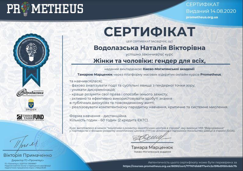 Викладачка циклової комісії економіки та управління Кременчуцького льотного коледжу Харківського національного університету внутрішніх справ Наталія Водолазська пройшла підвищення кваліфікації на платформі Prometheus з курсу «Жінки та чоловіки: гендер для всіх», що проведений викладачкою Києво-Могилянської академії Тамарою Марценюк.