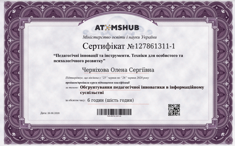 За успішно виконане завдання Олена Черніхова отримала сертифікат. Набуті знання будуть використані в навчальній та науковій діяльності.