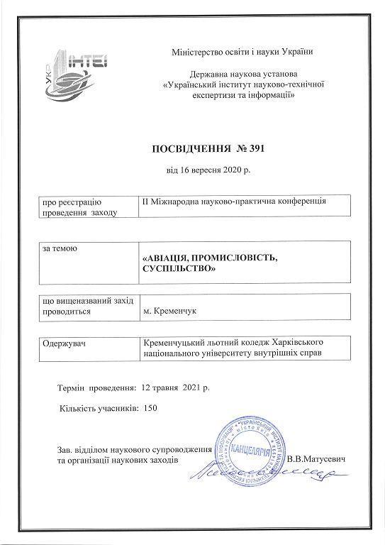 Науковим відділом Кременчуцького льотного коледжу Харківського національного університету внутрішніх справ були підготовлені документи для реєстрації наукового заходу в Державній науковій установі «Український інститут науково-технічної експертизи та інформації». 16 вересня 2020 року від УкрІНТЕІ отримано Посвідчення № 391 про зареєстровану ІІ Міжнародну науково-практичну конференцію «Авіація, промисловість, суспільство» з внесенням в інформаційний бюлетень «План проведення наукових, науково-технічних заходів в Україні». Науковий захід планується провести 12 травня 2021 року на базі коледжу.