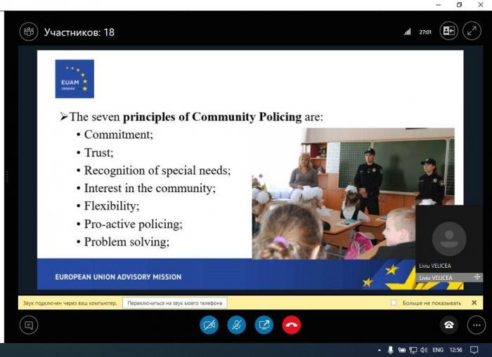 Вебінар був організований відділом міжнародного співробітництва університету та Консультативною Місією Європейського Союзу. Основними спікерами заходу виступили радники/тренери з питань взаємодії поліції з громадою Регіонального представництва КМЄС у м. Харкові Лівіу Веліча (Румунія) та Юрій Міхалков (Болгарія).