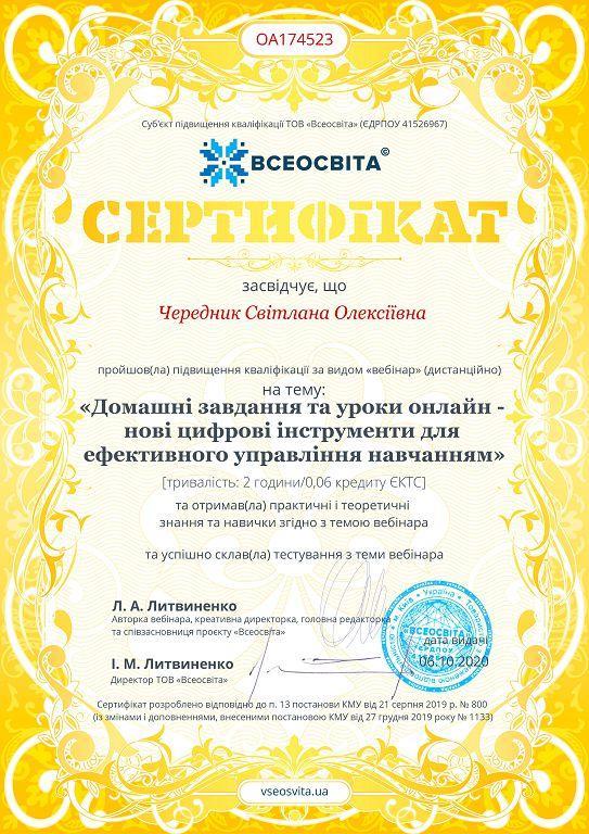 Викладачка циклової комісії філологічних дисциплін Кременчуцького льотного коледжу Харківського національного університету внутрішніх справ Світлана Чередник дистанційно взяла участь у вебінарі «Домашні завдання та уроки онлайн – нові цифрові інструменти для управління навчанням» на платформі «Всеосвіта».