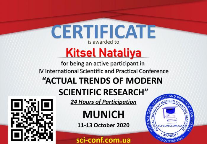 Завідувач лабораторії тестового контролю знань Кременчуцького льотного коледжу Харківського національного університету внутрішніх справ Наталія Кіцель дистанційно взяла участь у IV Міжнародній науково-практичній конференції «Аctual trends of modern scientificre search», яка проходила у м. Мюнхен, Німеччина. Тези її доповіді були присвячені питанню тестового контролю результативності навчання студентів. За результатами конференції видано збірку матеріалів.