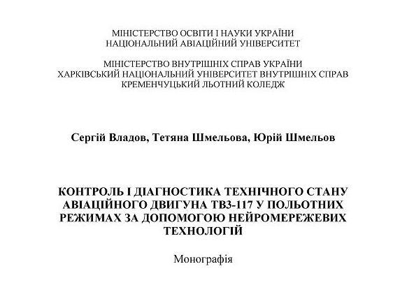 Працівниками Кременчуцького льотного коледжу Харківського національного університету внутрішніх справ – заступником директора коледжу кандидатом технічних наук Юрієм Шмельовим, завідувачем відділення планування навчального процесу фахової підготовки кандидатом технічних наук Сергієм Владовим, викладачем циклової комісії аеронавігації доктором технічних наук, доцентом Тетяною Шмельовою підготовлено монографію «Контроль і діагностика технічного стану авіаційного двигуна ТВ3-117 у польотних режимах за допомогою нейромережевих технологій».