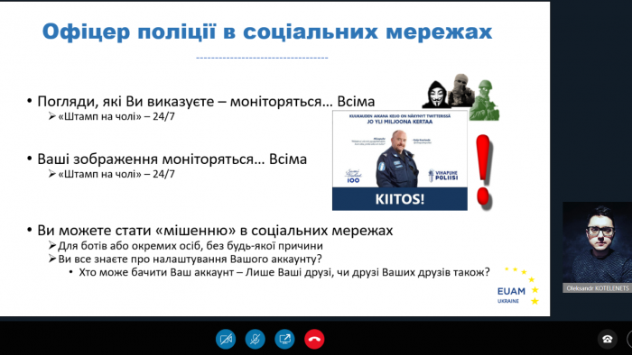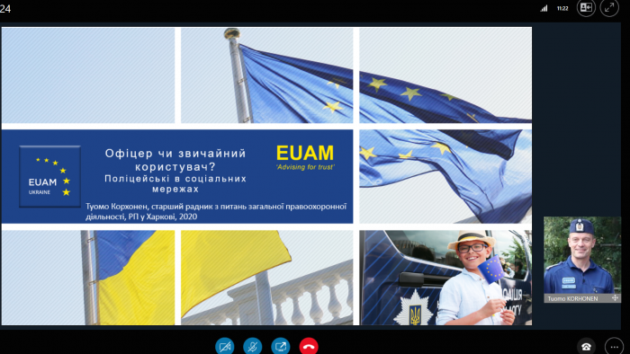 У Харківському національному університеті внутрішніх справ відбувся вебінар на тему «Офіцер чи звичайний користувач? Поліцейські в соціальних мережах». Основним спікером заходу виступив старший радник з питань загальної правоохоронної діяльності Регіонального представництва Консультативної місії ЄС у м. Харків Туомо Корхонен.