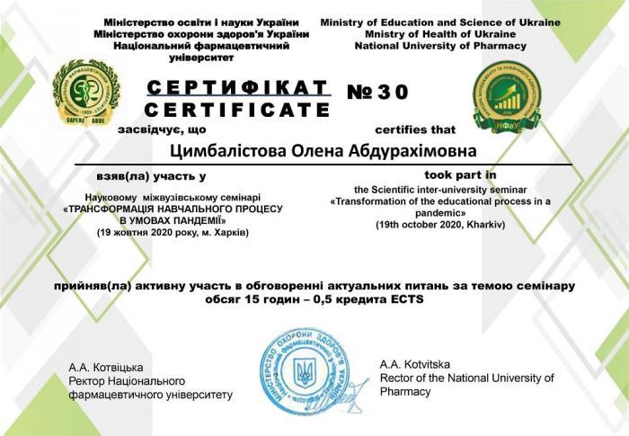 Голова циклової комісії економіки та управління Кременчуцького льотного коледжу кандидат економічних наук Олена Цимбалістова дистанційно взяла участь у Науковому міжвузівському семінарі «Трансформація навчального процесу в умовах пандемії», який проходив у Національному фармацевтичному університеті на кафедрі менеджменту та публічного адміністрування м. Харків.