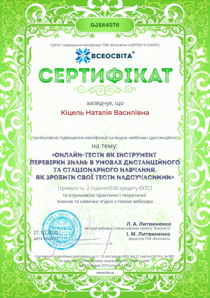 Завідувачка лабораторії тестового контролю знань Кременчуцького льотного коледжу Харківського національного університету внутрішніх справ Наталія Кіцель взяла участь у вебінарі від ТОВ «Всеосвіта» на тему «Онлайн-тести як інструмент перевірки знань в умовах дистанційного та стаціонарного навчання. Як зробити свої тести надсучасними».