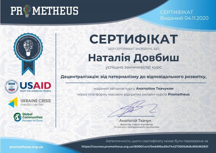 Успішно склавши іспит, Наталія Довбиш отримала сертифікат, що підтверджує знання по темі.