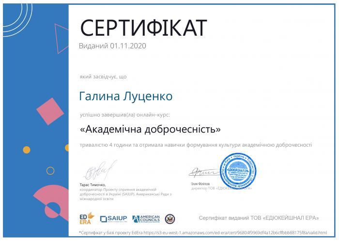 Представники Кременчуцького льотного коледжу Харківського національного університету внутрішніх справ пройшли онлайн-курс на тему «Академічна доброчесність» на платформі онлай-освіти Educational Era: Марина Петченко – начальниця наукового відділу, Наталія Довбиш – інспекторка наукового відділу, Галина Луценко – викладачка циклової комісії економіки та управління, Наталія Кіцель – завідувачка лабораторії тестового контролю знань.