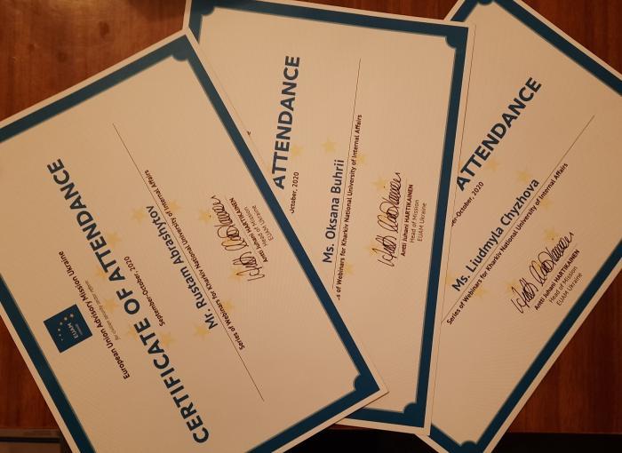 Після завершення вебінарів начальник відділу міжнародних зв'язків та міжвузівської роботи КЛК ХНУВС Рустам Абрашитов та фахівець цього ж відділу Оксана Бугрій, а також викладачка циклової комісії філологічних дисциплін Людмила Чижова, які проявили себе як найбільш активні учасники вебінарів від коледжу, отримали іменні сертифікати від Консультативної місії Європейського Союзу.