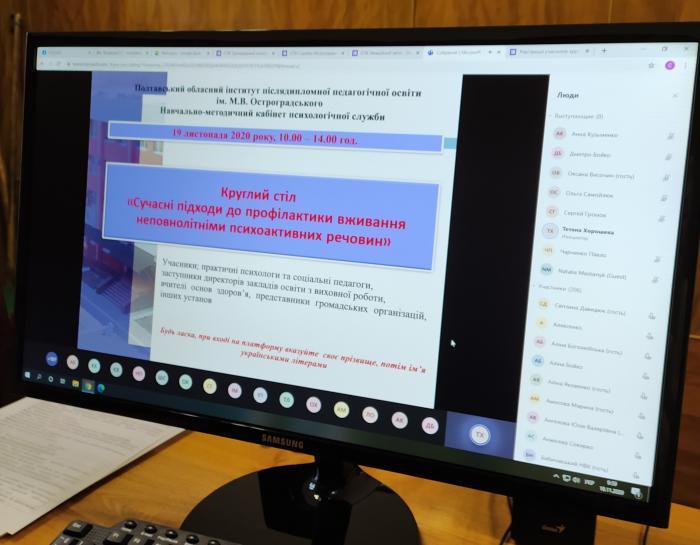 Завідувач відділення психологічного забезпечення відділу кадрового забезпечення Кременчуцького льотного коледжу Харківського національного університету внутрішніх справ Світлана Давидюк та фахівець відділення Оксана Тріско дистанційно взяли участь у 6-годинному засіданні круглого столу «Сучасні підходи до профілактики вживання неповнолітніми психоактивних речовин», організованого Полтавським обласним інститутом післядипломної педагогічної освіти ім. М.В. Остроградського.