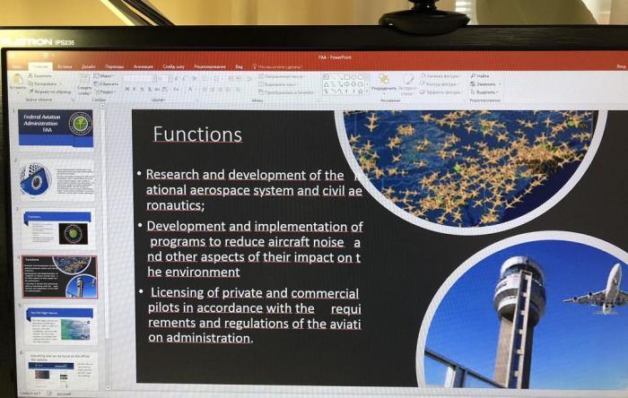 Здобувачі вищої освіти підготували доповіді-презентації англійською мовою та представили презентації про функції FAA та IATA асоціації повітряного транспорту.