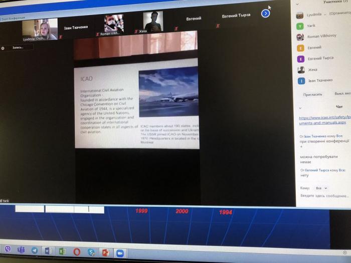 Під керівництвом викладачки циклової комісії філологічних дисциплін Кременчуцького льотного коледжу ХНУВС Людмили Чижової відбувся онлайн-семінар для членів наукового гуртка «Англійська мова ІСАО – важлива складова безпеки польотів». Семінар на тему «Міжнародні організації цивільної авіації ІСАО, ІАТА, IFALPA, FAA, EUROCONTROL» був присвячений Міжнародному дню цивільної авіації.