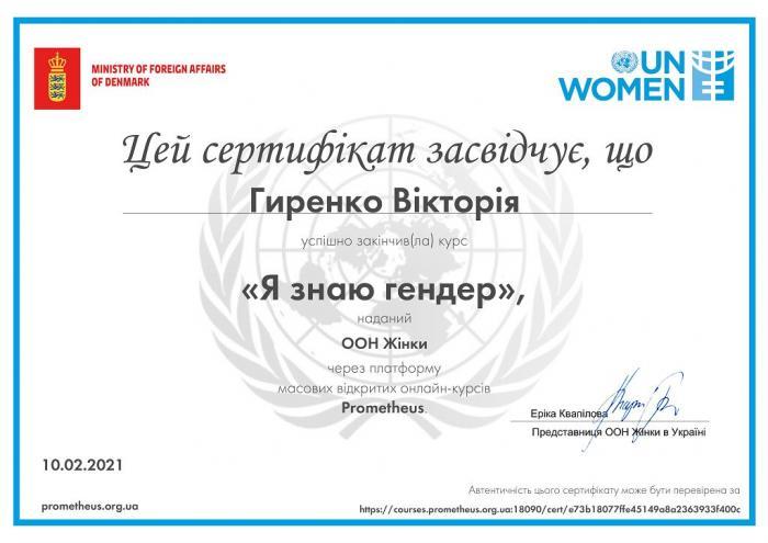 За ініціативи відповідальної з гендерних питань, начальниці наукового відділу Марини Петченко та інспектора наукового відділу Наталії Довбиш члени курсантсько-студентської ради Кременчуцького льотного коледжу Харківського національного університету внутрішніх справ Максим Сокур, Вікторія Гиренко, Дмитро Ходін, Юлія Калітієвська дистанційно пройшли загальноосвітній курс «Я знаю гендер» на онлайн платформі Prometheus та, за успішно складені іспити, отримали сертифікати.