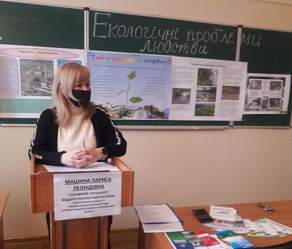 Лариса Машина розповіла про промислові підприємства міста, методи екологічної оцінки їх діяльності, об’єкти природно-заповідного фонду у м. Кременчук, історію їх створення, про проблеми утворення значної кількості побутових відходів, необхідність їх сортування, про шляхи підвищення екологічної культури мешканців та запросила до співучасті у різноманітних екологічних заходах.