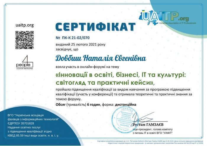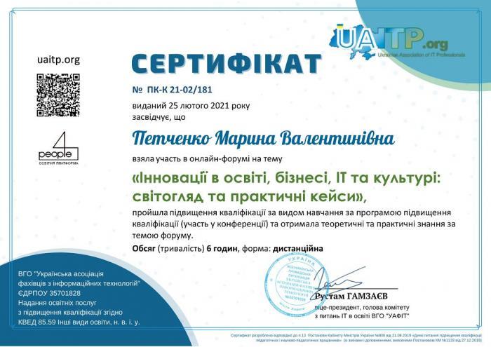 Представниці наукового відділу Кременчуцького льотного коледжу ХНУВС Марина Петченко, Наталія Довбиш і Наталія Кіцель дистанційно взяли участь у форумі-тренінгу на тему «Інновації в освіті, бізнесі, ІТ та культурі», проведеного за спільною ініціативою освітньої платформи «4 People», Української Федерації Інформатики та ВГО «Українська асоціація фахівців інформаційних технологій».