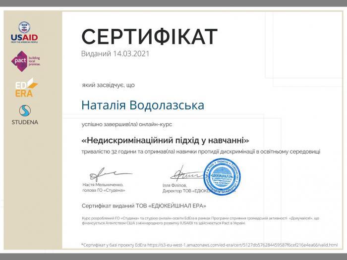 Викладачка циклової комісії економіки та управління Кременчуцького льотного коледжу Харківського національного університету внутрішніх справ Наталія Водолазська взяла участь в онлайн-курсі «Недискримінаційний підхід в навчанні», що розроблений ГО «Студена» та студією онлайн-освіти EdEra. Онлайн-курс знайомить із недискримінаційним і толерантним викладанням.