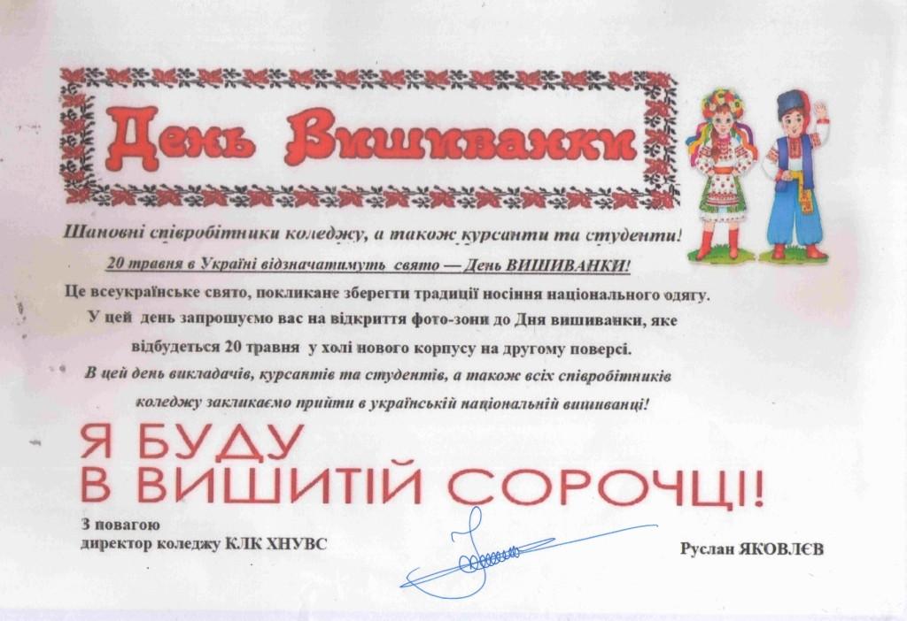 Колектив Кременчуцького льотного коледжу Харківського національного університету внутрішніх справ вітає усіх із прийдешнім Днем Вишиванки.