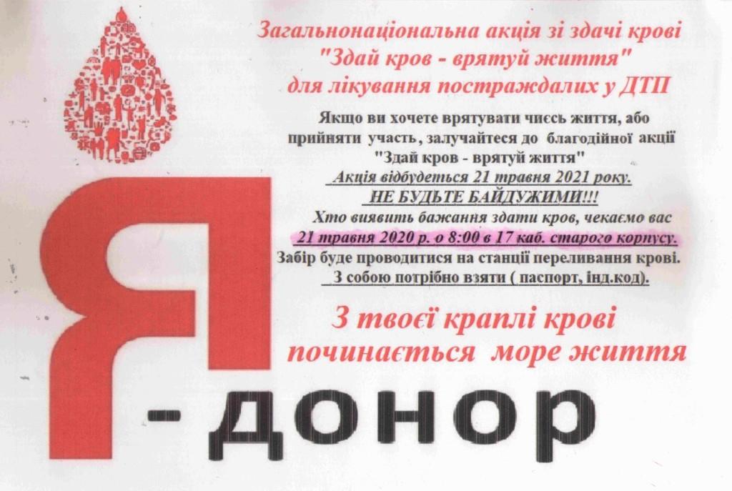 Колектив Кременчуцького льотного коледжу Харківського національного університету внутрішніх справ запрошує до участі в Загальнонаціональній акції "Здай кров - врятуй життя".