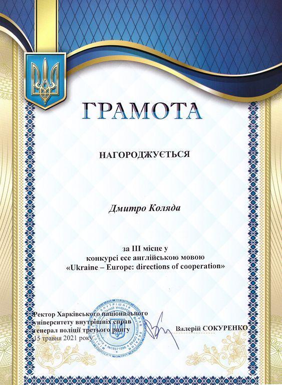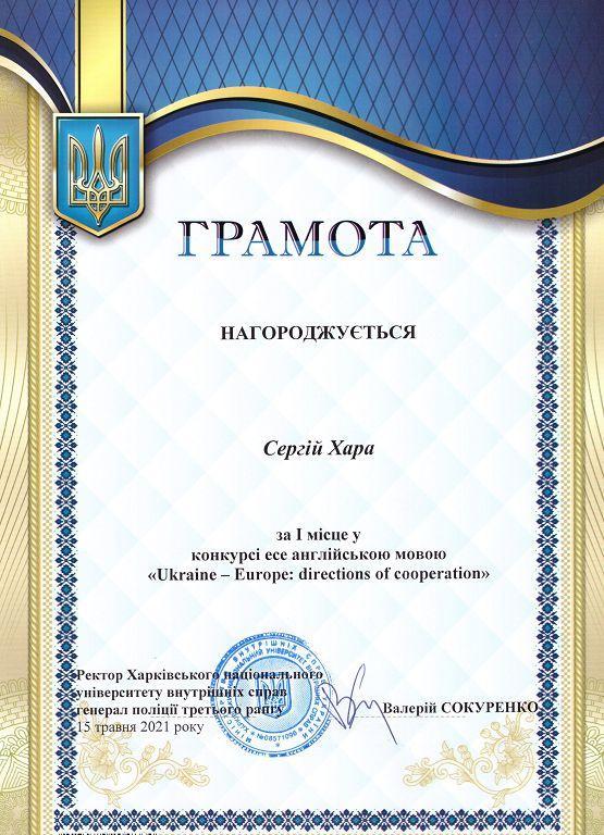 Підбито підсумки конкурсу есе англійською мовою «Ukraine – Europe: directions of cooperation» до Дня Європи в Україні, який був організований відділом міжнародного співробітництва та кафедрою іноземних мов факультету № 1 ХНУВС у межах Всеукраїнської інформаційної кампанії EUкраїна.