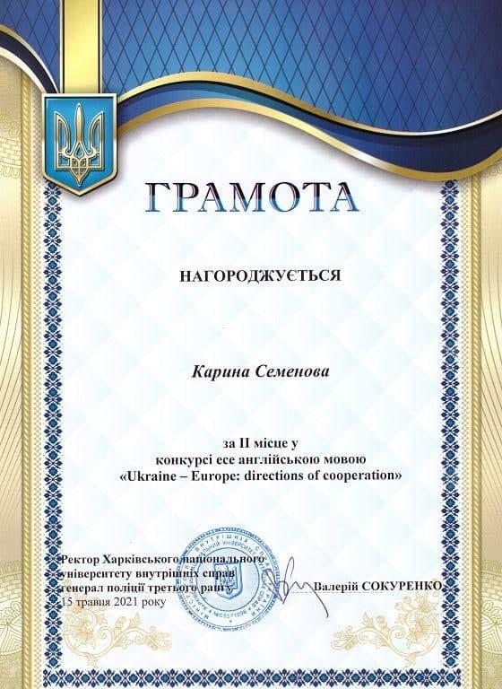 Під керівництвом викладача кафедри циклової комісії Ольги Кондрашової курсантка ІІІ курсу Карина Семенова отримала ІІ місце у конкурсі ессе англійською мовою «Ukraine –Europe: directionsofcooperation». До речі, це перша перемога Карини в подібному конкурсі. Вітаємо і бажаємо нових перемог!