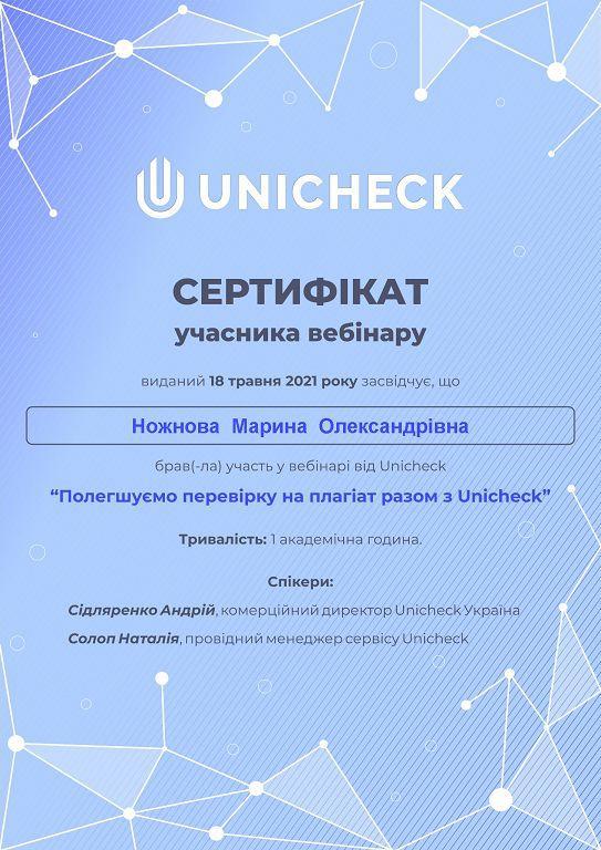 Відбувся онлайн-семінар «Полегшуємо перевірку на плагіат разом з Unicheck» від Національного агентства із забезпечення якості вищої освіти. У семінарі взяла участь голова циклової комісії «Аеронавігація» Марина Ножнова. Спікерами виступили: Андрій Сідляренко – комерційний директор Unicheck Україна та Наталія Солоп – провідний менеджер сервісу Unicheck.