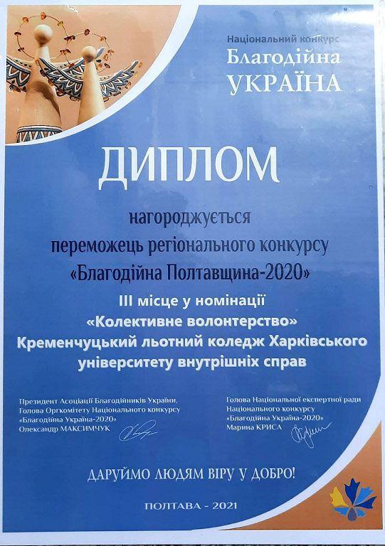 Кременчуцький льотний коледж Харківського національного університету внутрішніх справ вперше взяв участь у Регіональному конкурсі «Благодійна Полтавщина 2020» і посів ІІІ місце у номінації «Колективне волонтерство».