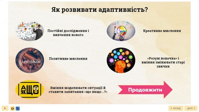 Курс включав наступні модулі: особливості гнучкості мислення (понятійний апарат «адаптивність», «гнучкість»; гнучкість, як найважливіший фактор адаптивності; прояви та вплив гнучкості мислення, як показник психологічного здоров'я та розвитку м'яких навичок); гнучкість мислення – якість успішних людей (як допомагає гнучкість мислення в кризових життєвих ситуаціях); практичні рекомендації (вправи) для тренування гнучкості розуму; корисні звички для розвитку гнучкості мислення; навички успішної людини ХХІ століття (гнучкість, як елемент успіху в сучасному світі; практичні методики розвитку гнучкості; як зміни впливають на людей та блокують адаптаційні процеси).