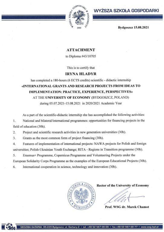 Начальник відділу міжнародних відносин та міжвузівської роботи Кременчуцького льотного коледжу Харківського національного університету внутрішніх справ Ірина Гладирь пройшла міжнародне стажування в польському університеті Wyższa Szkoła Gospodarki на тему: «Міжнародні гранти та дослідницькі проєкти від ідеї до реалізації: практика, досвід, перспективи».