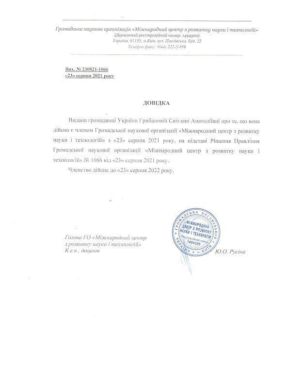Викладач-методист циклової комісії природничих дисциплін Кременчуцького льотного коледжу Харківського національного університету внутрішніх справ Світлана Грибанова стала членкинею Громадської організації «Міжнародний центр з розвитку науки і технологій».