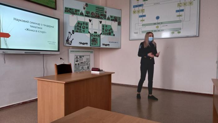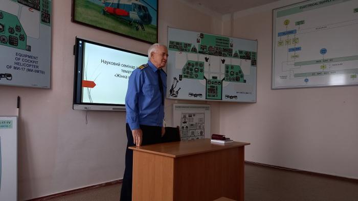 Професор циклової комісії авіаційного і радіоелектронного обладнання Кременчуцького льотного коледжу Харківського національного університету внутрішніх справ кандидат технічних наук Юрій Гаврилюк провів для учасників освітнього процесу науковий семінар на гендерну тематику «Жінка в історії авіації».