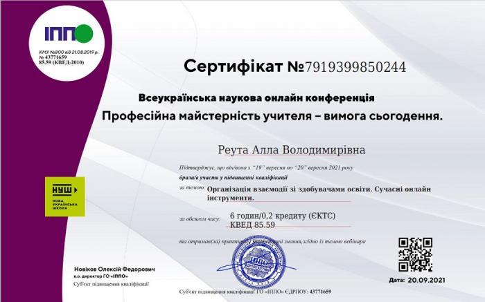 Викладачка циклової комісії технічного обслуговування авіаційної техніки Кременчуцького льотного коледжу Харківського національного університету внутрішніх справ Алла Реута взяла участь у всеукраїнській науковій онлайн-конференції «Професійна майстерність учителя – вимога сьогодення».
