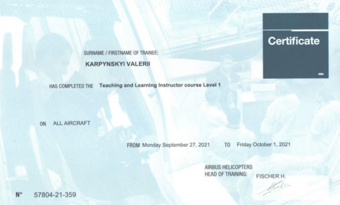 Авіаційній технік з приладів та радіоустаткування цеху обслуговування авіатехніки авіаційно-технічної бази інженерно-авіаційної служби Кременчуцького льотного коледжу Харківського національного університету внутрішніх справ Валерій Карпинський успішно пройшов повний курс навчання у навчально-тренувальному центрі компанії «Аairbus Helicopters» у м. Маріньян (Франція) на курсах «H125 Type Rating for Avionics no Part 147» та «H125 Modules for Technicians Instructors Avionics». Курси було організовано та проведено компанією «Airbus Helicopters» у рамках виконання контракту щодо поставки 55 гелікоптерів для органів системи Міністерства внутрішніх справ України.