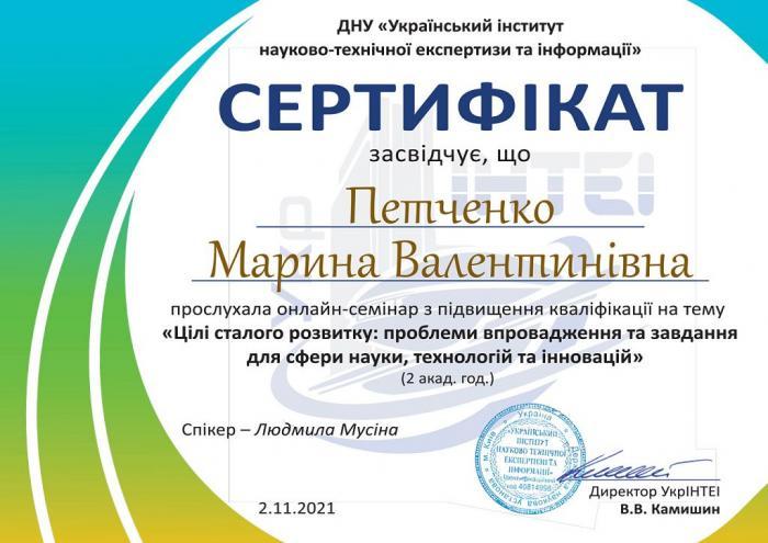 Марина Петченко отримала сертифікат підвищення кваліфікації, а отримані знання будуть використані в науковій діяльності.