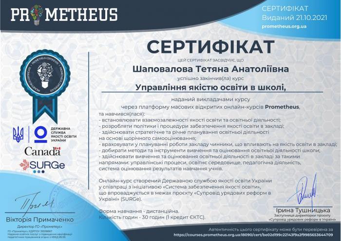 Інженер з якості відділу управління якістю (авіаційна складова) Кременчуцького льотного коледжу Харківського національного університету внутрішніх справ Тетяна Шаповалова пройшла дистанційно курс на тему «Управління якістю освіти в школі» на освітній платформі Prometheus.
